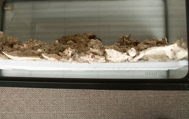 一応、完成しましたが、炭酸カルシウムの粉末を取り除く為に水槽に水を入れて洗浄しました。
