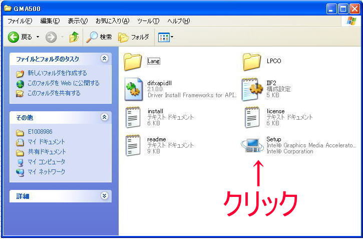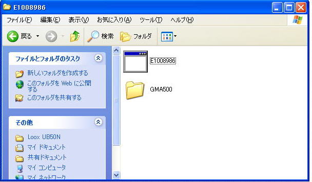 Loox UB50と言うフォルダを作り、その中に順番をつけた20個以上のフォルダを作ります。 たとえば、インテル GMA500 ディスプレイドライバであれば、二番目のインストールである「2.E1008986」と言う名前のフォルダを作り、その中にE1008986のドライバーを入れます。左写真そのドライバー をクリックしますと、自動的に解凍されて次の写真の様になります。