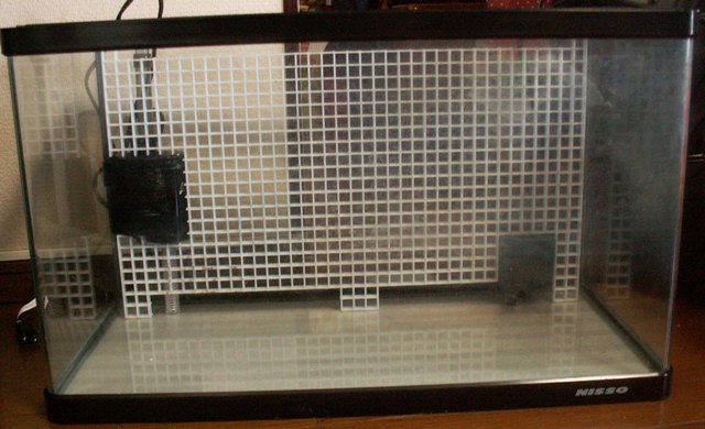 生体に害はありませんし、ただし、貼り付けるのに補強として下記の様なプラスチックの網を使ってくださいね。(以前の写真ですから、今回は若干の修整があります。写真にあるようなポンプは外しました。)