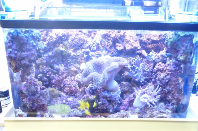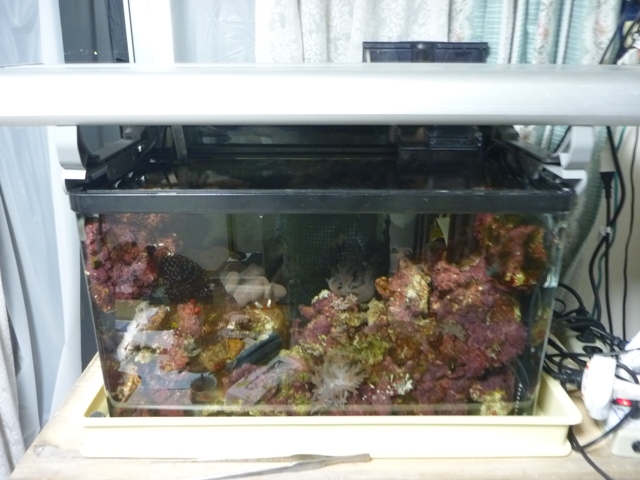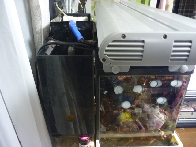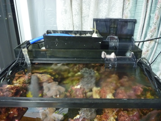 早速、キッチンカウンターの上に60規格水槽を設置し、ライブロックやら珊瑚やら魚など海水もほとんど移動させました。