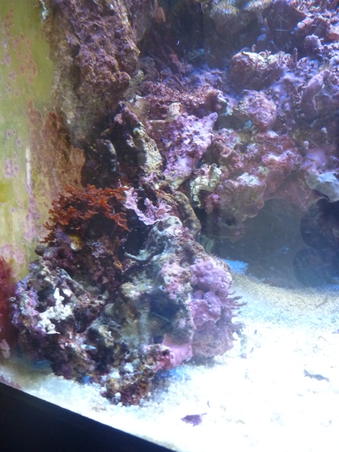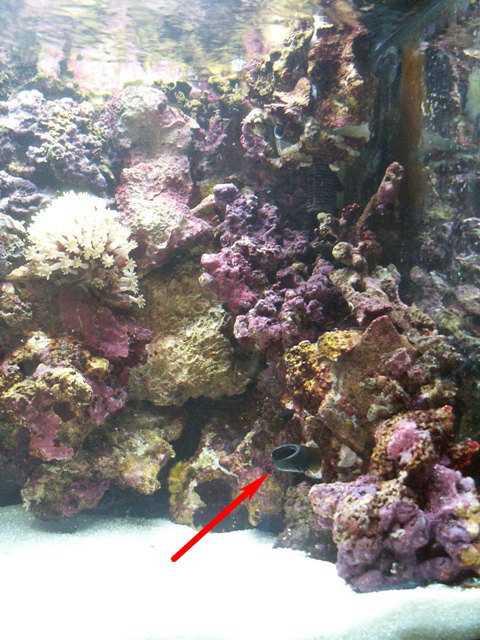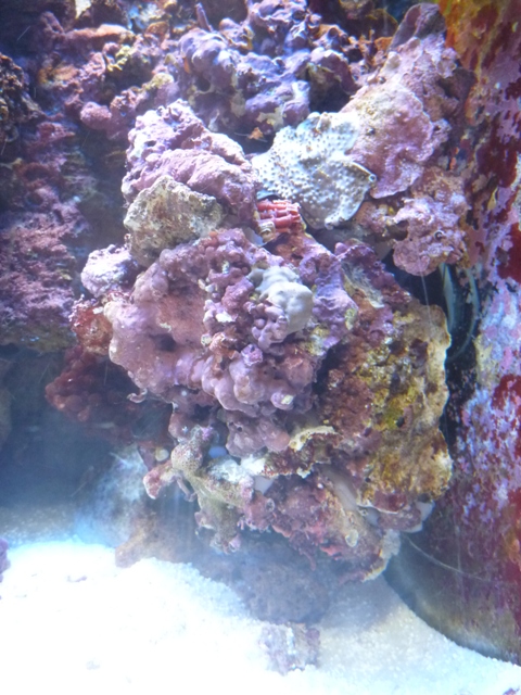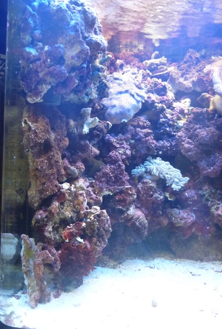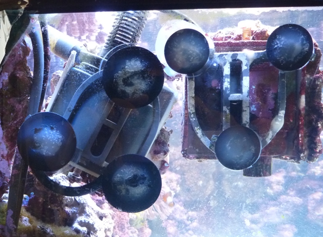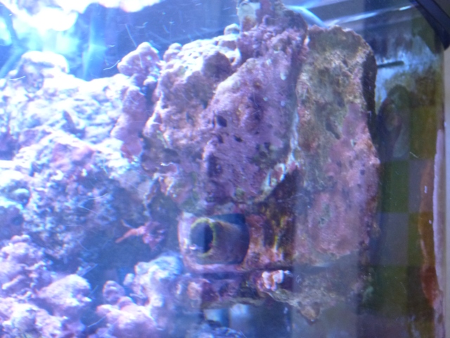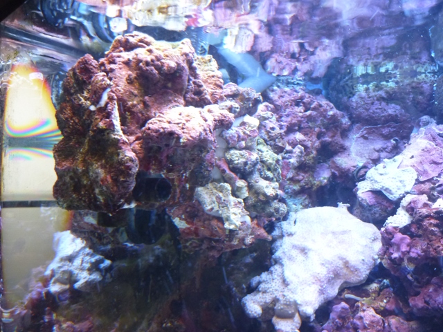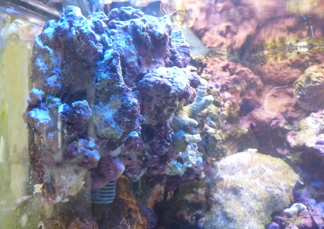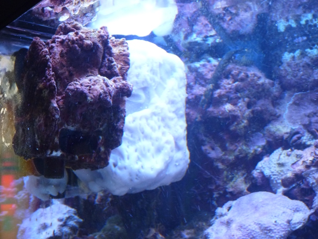 水槽左側のライブロックバスケット(私の造語ですが、・・・・)ですが、その後ろに隙間がある?と言うか、吸盤が見えますのでなんとなく不自然に見えます。